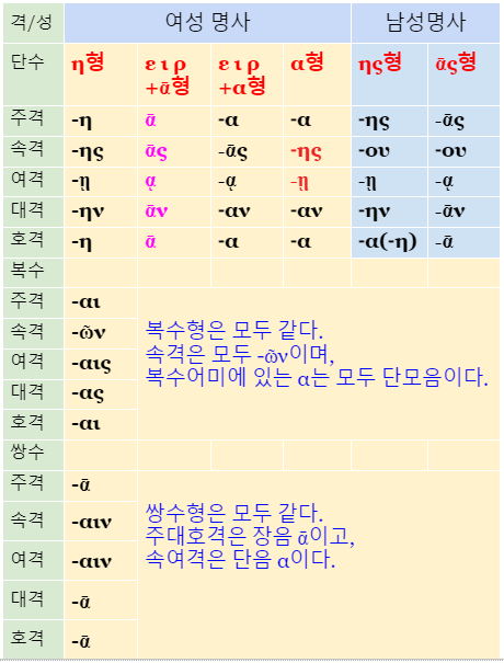 ㅇ 위 표에서 제시한 어미는 실제로는 어간모음(η, ᾱ, α) + 격어미가 융합된 것으로 명사 1, 2변화는 이 융합된 형태를 기억하는 것이 편리하다.