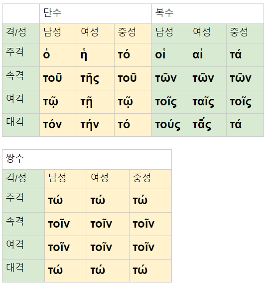 <참고> 정관사 ὁ, ἡ, τό 변화표