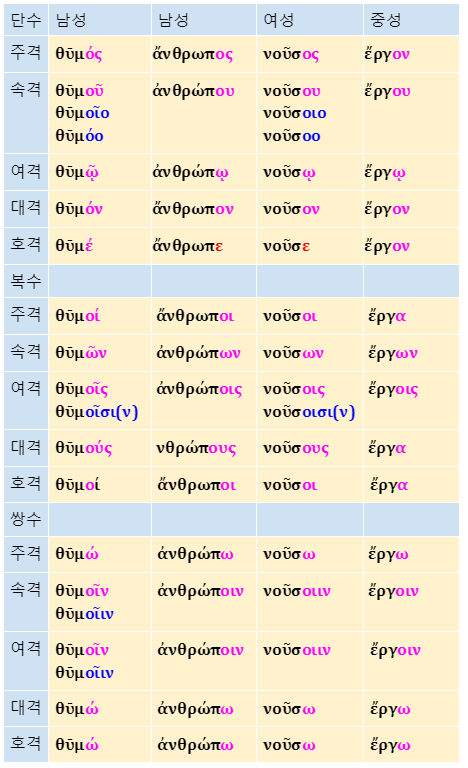 ㅇ 복수 속격은 1변화 명사와는 다르게 항상 ῶν으로 끝나지 않는다. 2변화 명사는 마지막 음절에 액센트가 있는 경우에만 복수 속격에서 θῡμῶν과 같이 ῶν으로 끝난다.