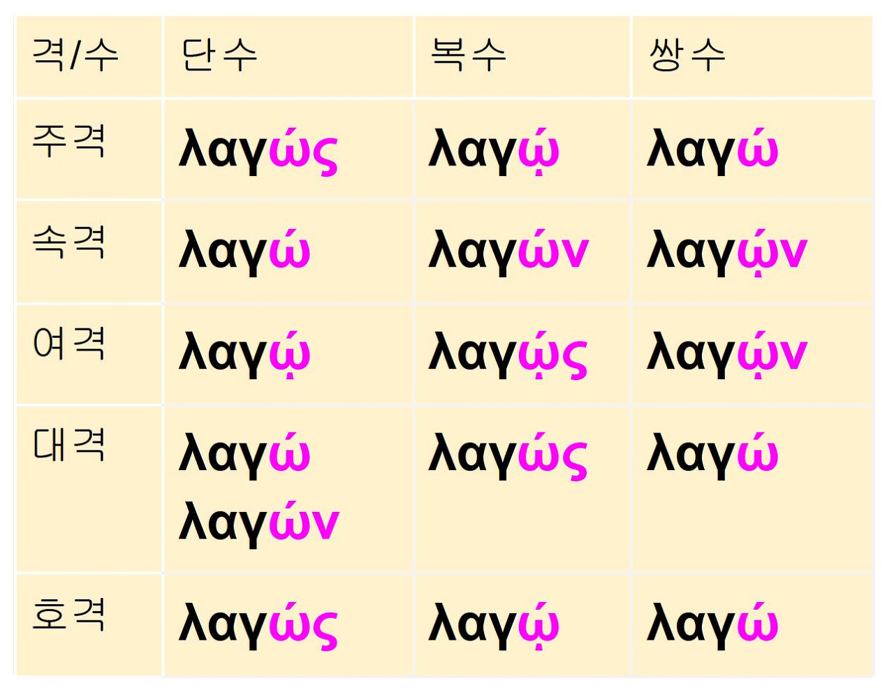 ☞ λαγώς의 이형들 : λαγωός(호머, 이오니아), λαγός(이오니아), λαγῶς