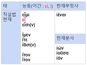ㅇ 단수 어간은 εἰ이고, 복수와 쌍수어간 그리고 부정사와 분사어간은 ἰ이다.