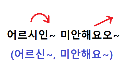 '어르시↗인↘, 미안해요오↗'가 곡강세와 상강세 액센트를 이루고 있다. 강세가 낱말 뒤쪽에 오는 것도 고대 그리스어와 한국어가 서로 닮았다.