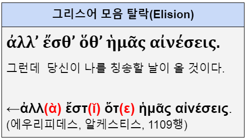 이런 지식은 고대 그리스어 독해 중에 μ’, εἶν᾽, οἴμ’ 등등을 만나면 원래 어형이 무엇이었는지 추정하는데 도움이 된다. μ’ = με 나를, μοι 나에게