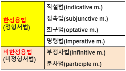 (4) 명령법(imperative m.) - 명령을 나타낸다. 명령을 나타내므로 1인칭 변화는 없다. 그리스어에는 별도로 쓰이는 동사의 변화형이 있다.