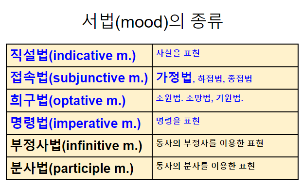 쉽게 말하면 서법은 '말의 의도를 표현하는 방식에 따른 동사의 변화형' 정도의 의미이다. mood는 기본 뜻이 '분위기'이므로 '말하는 분위기'라고도 볼 수 있다.