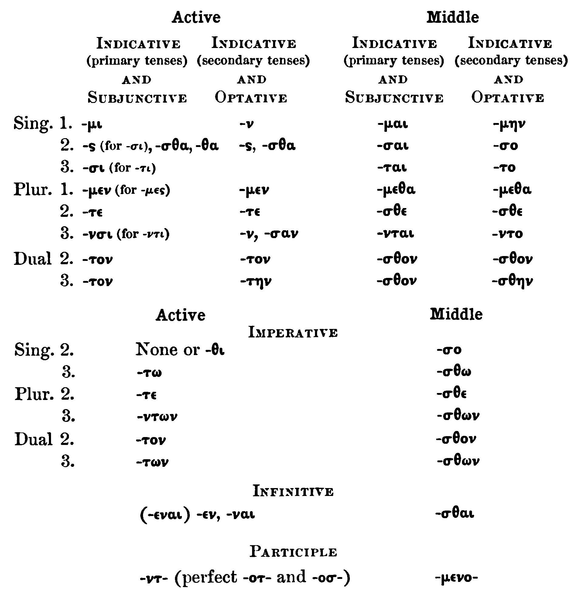 * 복수 3인칭 -ᾱσι(1차어미)와 -σαν(2차어미)은 연결모음(ο, ε)과 함께 사용하지 않음.