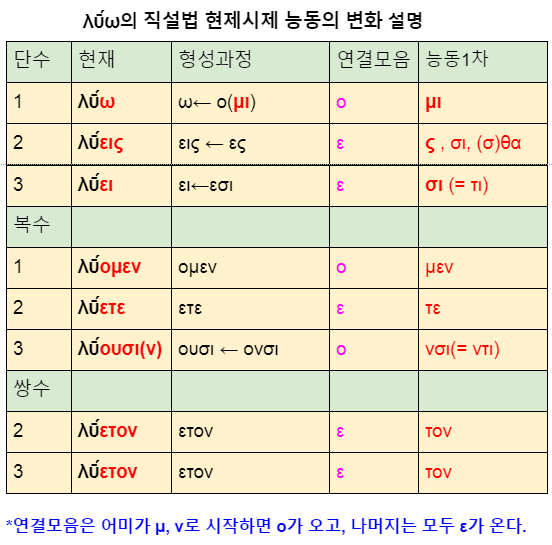 그리스어도 마찬가지다. 바로 이 활용을 익히는 것이 동사어형을 익히는 것이고, 이를 다시 말하면 동사 어간에 인칭어미를 붙히는 방법을 공부하는 것이다.
