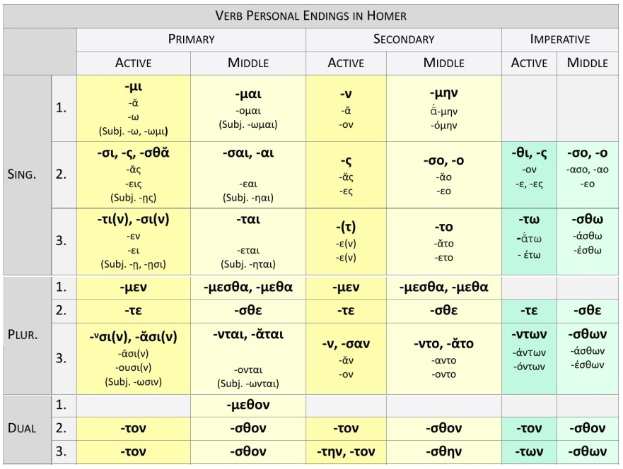 A Grammar of the Homeric Dialect(David Binning Monro, 1891)에는 약간 번잡한 정리표가 있다. 실제 문장에서 나타난 변형까지 모두 수집하여 만든 것이다.