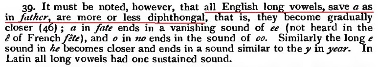 레인교수의 설명에 의하면, 영어에서는 장모음을 발음할 때, 장모음 a는 '에이', 장모음 o는 '오우', 장모음 i는 '이이(iy)'와 같이 두번째로 이어지는 소리가 점차로 닫히는 방식으로 발음한다는 것이다. 반면에 모든 그리스어와 라틴어의 장모음은 일관되고 지속적인 소리(one sustained sound)를 낸다.