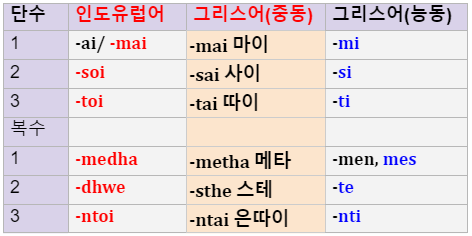 아래 표는 원시 인도유럽어의 동사 기본형 어미와 그리스어 동사 어미를 비교한 것이다. 원시 인도유럽어족의 동사의 기본어미가 그리스어 중수동태 어미와 거의 똑같은 것으로 보아 동사는 중동태로부터 시작되었다는 주장을 뒷받침하고 있다.