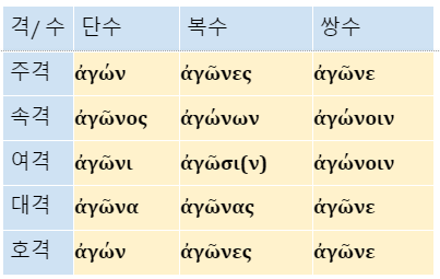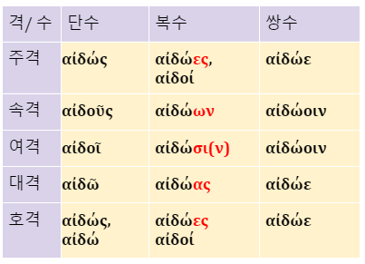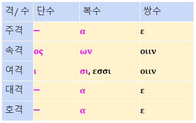 복수 : α, ων, σι, α, α (아, 온-, 시, 아, 아)