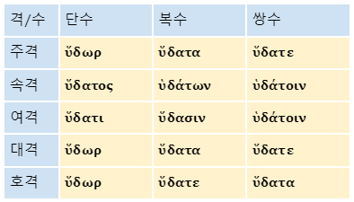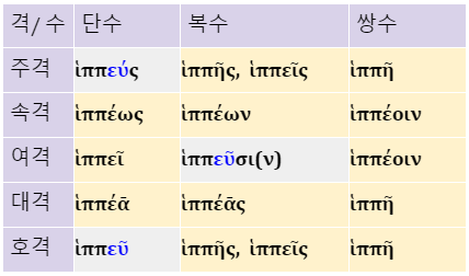 * 어간 πόλι-는 단수 주대호격에서 나타난다. 나머지 격에서는 어간이 ε로 바뀐다.