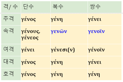 * 단수 속격이 -ος가 아니고 -ως나 -ους 등이면, 생략 축약 등 음운변화의 결과로 보고 이해한다.
