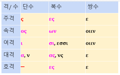 단수 : ς, ος, ι, α [ν], ─ (스, 오스, 이, 아, 무)