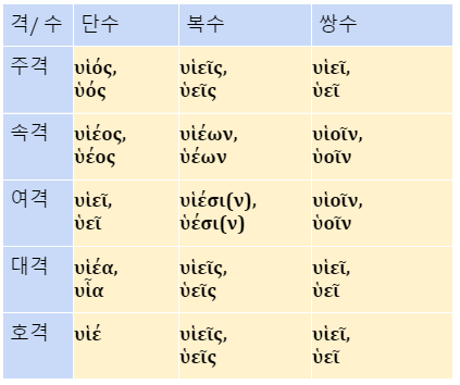 * υἱός는 2변화 규칙 변화형도 있다(υἱός, υἱοῦ, 등, ὑός, ὑοῦ 등).