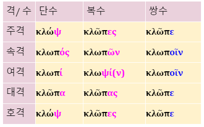* 단수 호격 κλώψ : 기본형이 - ψ로 끝나므로 호격에서도 ς가 유지된다.