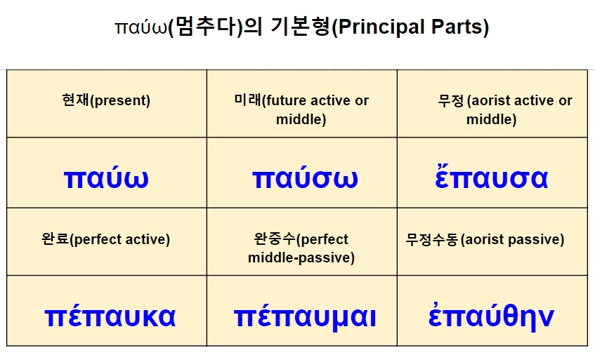 2) ω동사 παύω(나는 정지한다)의 6가지 기본형 예시