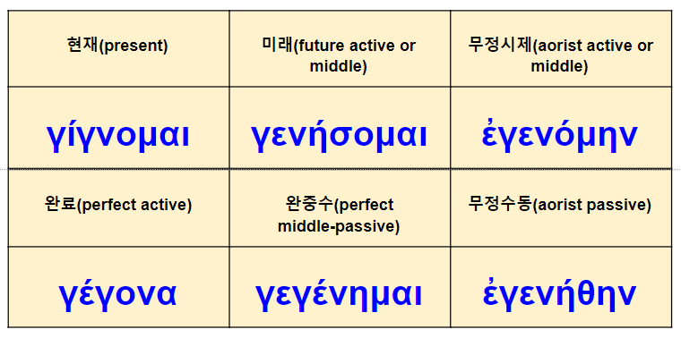 3) 탈형동사 γίγνομαι(생겨나다)의 6가지 기본형 예시
