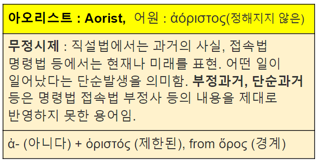 * 그리스어에는 과거에 일어난 일을 나타내는 시제가 4가지이다. ① 미완료시제(과거 어느 시점에 진행 중이었거나 반복되었던 일), ② 무정시제(aorist, 단순한 발생을 의미), ③ 완료시제(이미 완료된 일의 결과가 현재에도 남아 있는 것), ④ 과거완료시제(과거의 어느 시점을 기준으로 그 이전에 발생한 일)