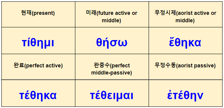 τίθημι, θήσω, ἔθηκα(pl. ἔθεμεν), τέθηκα, τέθειμαι, ἐτέθην, 놓다, 두다