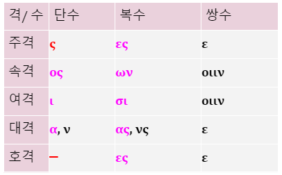 단수 : ς, ος, ι, α [ν], ─ (스, 오스, 이, 아, 무)