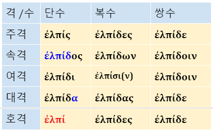 주격 : ἡ ἐλπίς ← ἐλπίδς (δς에서 δ탈락, ί가 장음화되지 않음)