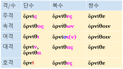 * 단수 주격 ὄρνῑς ← ὄρνῑθ+ς (σ앞의 θ 탈락)
