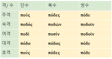 * 단수 주격 πούς ← πόδς (ς앞에 δ가 탈락하고 모음의 보상성 장음화)