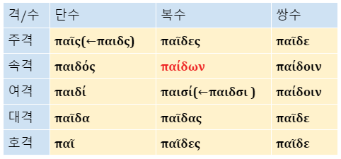 * 단수 주격 παῖς ← παῖδς (ς 앞의 δ는 탈락)
