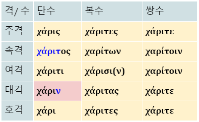 * 단수 주격 χάρις ← χάριτς (ς앞의 τ 탈락)