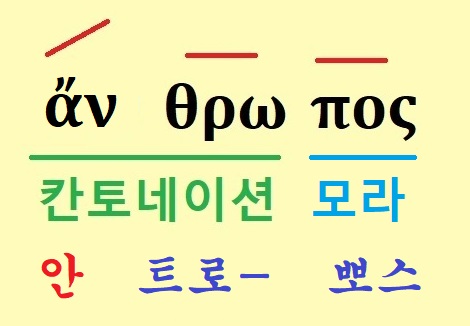 ἀνθρώπων(안트로-뽄-, 사람들의) ων이 장음절이므로 상강세가 온다.