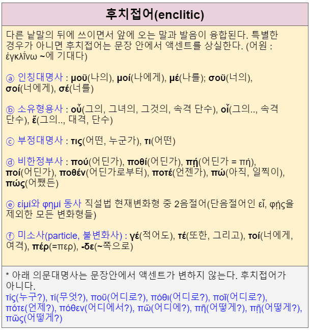 ☞ 호머 그리스어 인칭대명사 εὗ, εὑ, ἕθεν, ἑθεν(그의, 그녀의, 그것의) οἷ, οἱ(그에게), ἕ, ἑ(그를), σφέων, σφεων(그들의), σφίσι(ν), σφισι(ν)(그들에게), σφᾶς, σφας, σφέας, σφεας(그들을, 남/녀성), σφέα, σφεα(그들을, 중성) σφωέ, σφωε, σφώ, σφε(그들 둘을) 등도 후치접어이다.