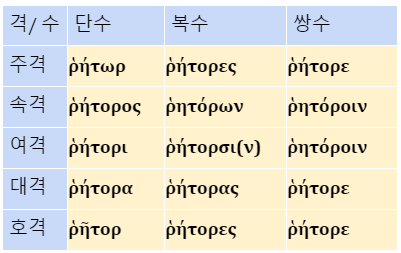 ☞ 학자에 따라 단수 주격은 어간 ῥήτορ가 어미 없이 사용된 것이며, ο가 ω로 바뀐 것은 모음강화(불규칙 변화를 설명하는 방법 중의 하나) 현상으로 보기도 한다.