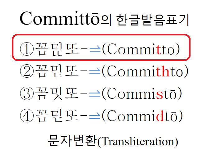 위에 예시한 라틴어 낱말의 한글발음표기는, 꼼미ㄸ또, 꼼밑또, 꼼밋또, 꼼믿또 등이 가능하다. 한국어로는 이들 소리가 모두 비슷하다. 그러나 이 한글발음만 보고 다시 문자변환(Transliteration)을 하면 제각각 다르게 나오는 문제가 생긴다.