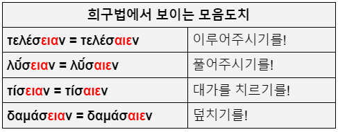 흔히 접할 수 있는 모음도치는 희구법 무정시제 3인칭 복수 어형이다.