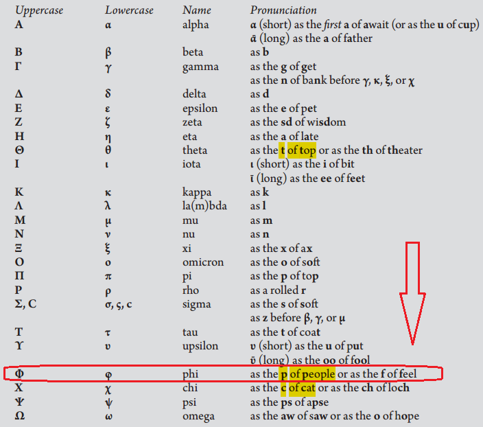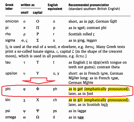 예일대 교재에서는 "φ음은 people에서 p(프)에 해당하는 음이거나 feel에서 f에 해당하는 음"이라고 설명하고 있다. 영어의 p음은 프랑스어나 이탈리아어 등 로망스계 언어와 달리 기본적으로 기식음이라는 설명을 예일대 고전어 교재에서 보았다. 거기에 나온 설명에 의하면, 원래 φ음은 '프'음이지만, 관행적으로 f 발음하는 경우가 있는데, '프'으로 발음하는 것이 바람직하다고 나온다. 미국인다운 실용주의다.