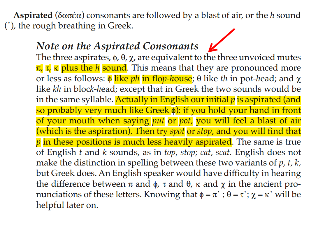 (원문) φ like ph in flop-house. (중략) Actually in English our initial p is aspirated (and so probably very much like Greek φ): if you hold your hand in front of your mouth when saying put or pot, you will feel a blast of air (which is the aspiration). Then try spot or stop, and you will find that p in these positions is much less heavily aspirated.)