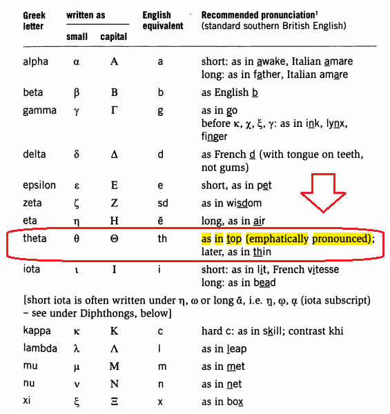 "θ는 top(탚)에서 t에 해당하는 음이며, 강조해서 발음한다. 나중에는 thin에서 th에 해당하는 음으로 바뀌었다."