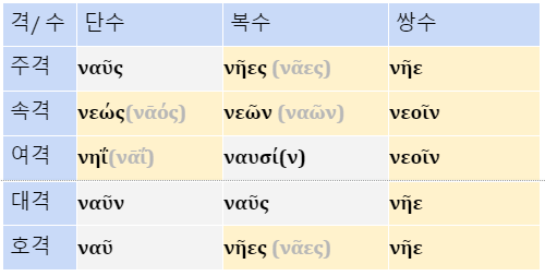 대격 : ναῦς → νηῦς ( ναῦ + νς에서 ς앞의 ν탈락)