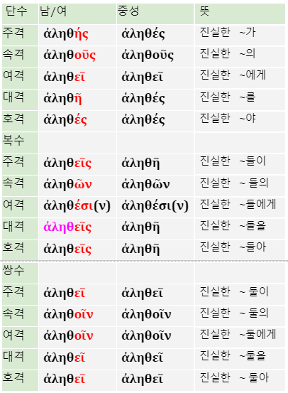 (2) ἀληθής, ἀληθές의 어형변화 설명(어간 : ἀληθες)