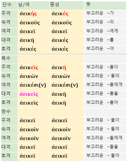고대 그리스어 형용사 어형변화 카테고리 글 목차 1) 형용사의 기본 용법과 종류 고대 그리스어 형용사의 용법 형용사의 종류 2) 형용사 1-2변화 형용사 1-2변화 -ος, -ᾱ, -ον형 (2-1-2형, 3어미) 형