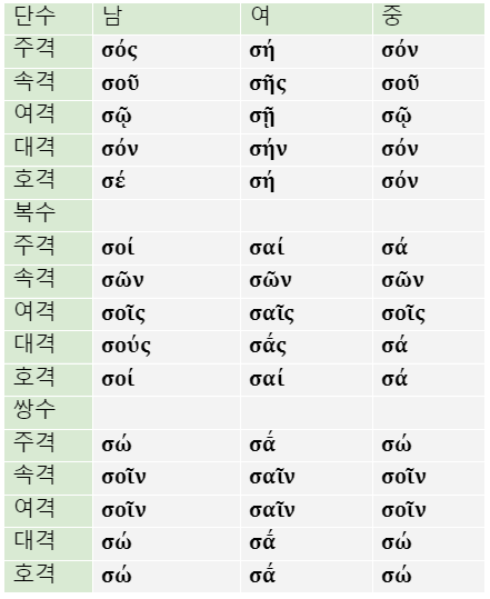 2) σός, σή, σόν의 어형변화