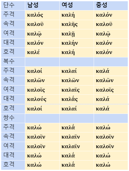 단수 : καλός, καλοῦ, καλῷ, καλόν, καλέ