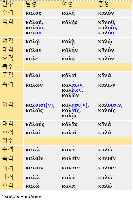 ㅇ 어간이 ο와 η로 끝나는 형용사이다. καλός(아름다운, 남성)와 καλόν(중성)은 어간이 καλό-이고 어미는 -ς와 -ν이며, καλή(여성)는 어간이 καλή이고 격어미는 없다. -ος, -η, -ον는 어간모음과 어미가 결합된 형태이며, 흔히 이를 격어미 대신 어미로 활용한다.(참고 : 명사 1변화, 명사 2변화)
