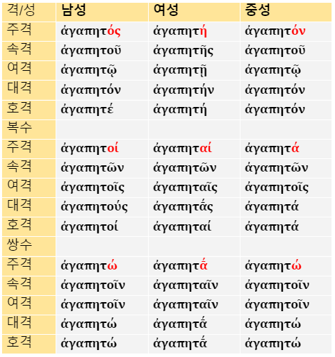 (2) ἀγαπητός, ἀγαπητή, ἀγαπητόν : 사랑스러운, 사랑하는(1.2 변화 형용사)