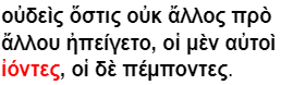 οὐδεὶς ὅστις οὐκ ἄλλος πρὸ ἄλλου ἠπείγετο, οἱ μὲν αὐτοὶ ἰόντες, οἱ δὲ πέμποντες.(Lucian, Alexander. 섹션 30)