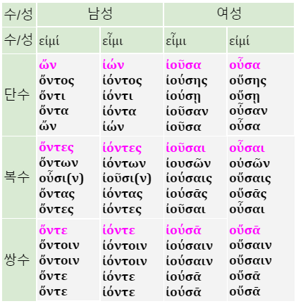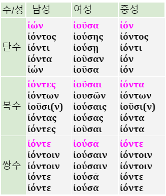 εἰμί(이다)와 εἶμι(가다)의 현재분사는 ἰ가 추가되는 것을 제외하면 서로 같다.