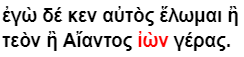 (어휘) ἐγὼ(내가) δέ(그러면) κεν(아마도) αὐτὸς(스스로) ἕλωμαι(고르겠다, 접속법, 의지, 무정 중동 1인칭 단수) ἢ(또는) τεὸν(= σός, 당신의, 소유형용사, 중성 대격 단수) ἢ(또는) Αἴαντος(아이아스의, 남성 속격) ἰὼν(가서, 현재분사 능동 남성 주격 단수) γέρας(명예의 선물을, 중성 대격 단수)