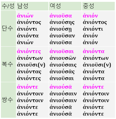 ◈ 이 번잡해 보이는 어형들을 막무가내로 외우려고 하면 좀 힘들 수도 있다. 속격 ἀνιόντος를 통해 어간 ἀνιόντ-를 알아내고, 3변화 어미와 1변화 단모음 알파 어미를 암송해 두었다가 여기에 적용하면 쉽게 구별하고 기억할 수 있다.