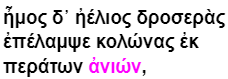 ἦμος δ᾽ ἠέλιος δροσερὰς ἐπέλαμψε κολώνας ἐκ περάτων ἀνιών, (아폴로니오스. 2.165)